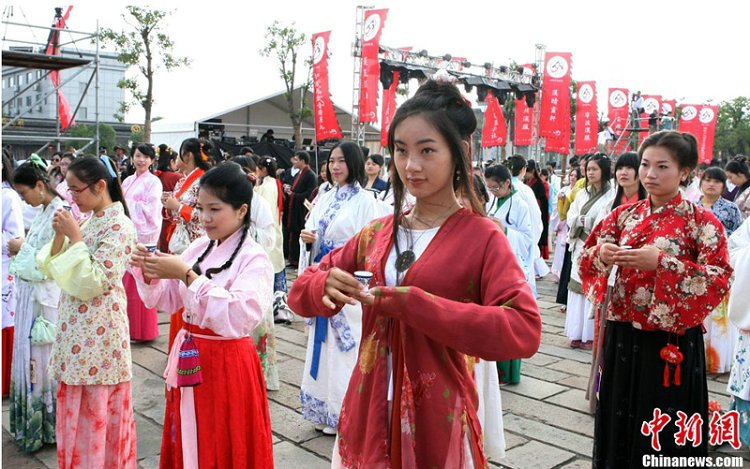 幕,370余名汉服文化爱好者共同举杯完成了传统的乡饮酒礼仪式,创下了世界最多人着汉服参加乡饮酒礼的世界纪录。乡饮酒礼是