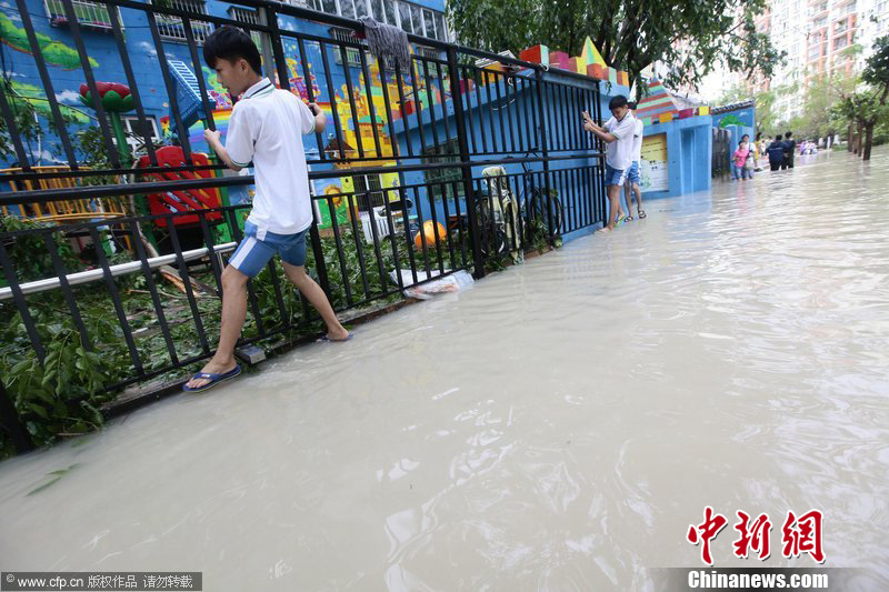2013年11月11日上午10时,尽管“海燕”台风已过去,但海南三亚市城区多条街头暴雨积水成灾,车辆难行。驻地部队及环卫、园林等部门纷纷出动,清理风后灾情,恢复城市面貌。陈文武 摄 图片来源:CFP视觉中国
