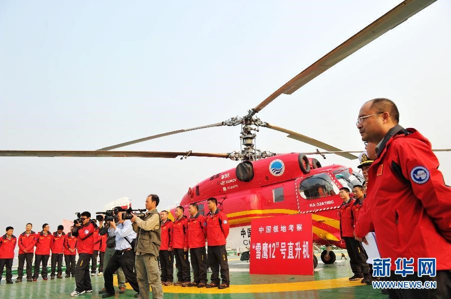 11月6日,“雪龙”号极地科学考察船上举行“雪鹰12”号直升机入列仪式。为提升中国极地科学考察的保障能力,考察队自2009年起专门配置了具有较强运输保障能力的KA32型直升机,命名为“雪鹰”号。在执行中国第28次南极科学考察任务期间,“雪鹰”号直升机损毁。在过去的一年多时间里,托管单位中信海直通用航空有限责任公司和承保公司太平洋保险公司深圳分公司开展了积极有效的善后工作,于今年9月重新从俄罗斯购置了一架新的KA32直升机(注册号B-7817),命名为“雪鹰12”号,将执行中国第30次南极科学考察任务。新华社记者 张建松 摄