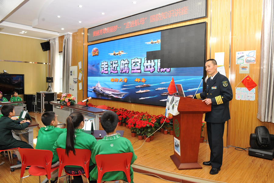 图为国防大学郐舟教授来到芳草地国际学校日坛校区,参与了“走近航母——国防知识讲座”活动。