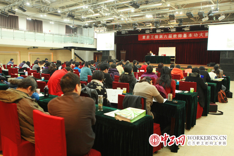 11月21至22日素质工程第六届教师教学基本功大赛决赛在北京蟹岛度假村多功能厅举办。来自素质工程站点和高校兼职教师聆听了专家关于培训技能技巧的讲座,并观摩了教师教学教法的示范比赛。中工网记者 段瑜摄