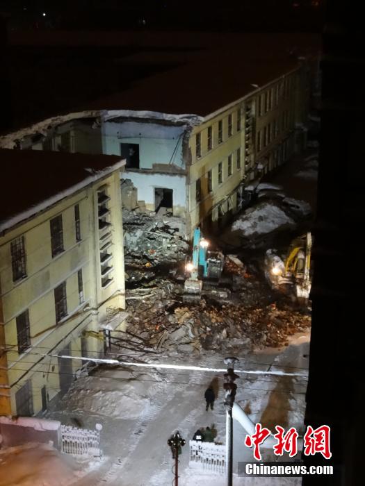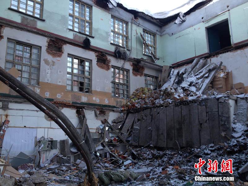 11月25日13时21分,黑龙江省牡丹江市康佳街北侧一处三层老厂房在暴雪中发生楼顶坍塌,事故造成9人死亡。中新社发 倪子牮 摄