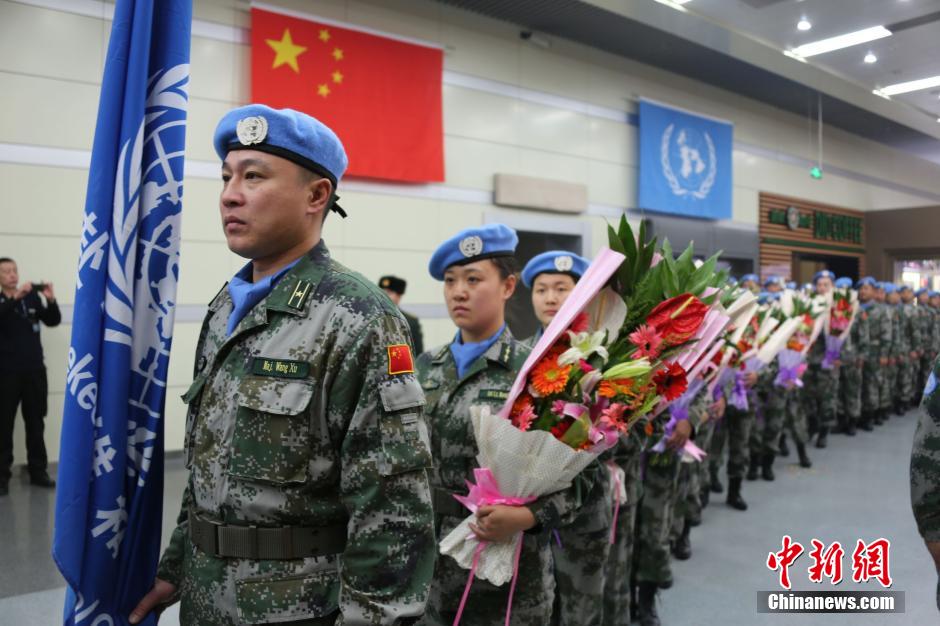 12月3日晚19时许,沈阳军区在哈尔滨太平国际机场举行仪式,欢送中国首批赴马里维和部队先遣队出征。中新社发 李祥辉 摄