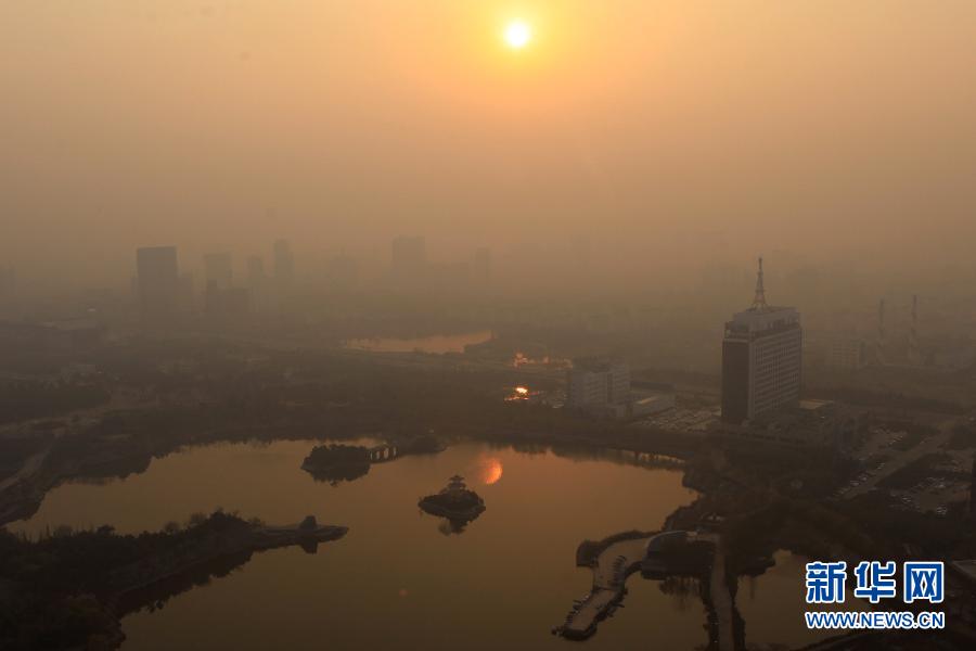 12月3日,山东省日照市新市区建筑群笼罩在雾霾中。山东省气象台于12月3日17时继续发布霾黄色预警信号,预计3日夜间到4日白天,山东省大部分地区中度霾天气仍将持续。 新华社发(李晓龙摄)