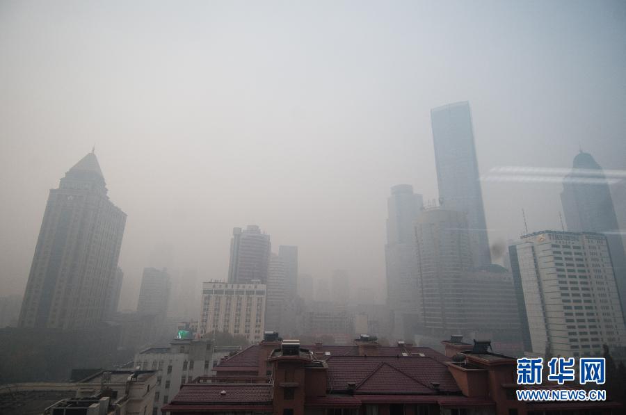 南京市中心新街口能见度低(12月5日摄)。江苏省南京市4日傍晚将空气污染预警由橙色升级为红色,这是该市2013年首次启动空气污染红色预警,预计重度污染天气还将持续两到三天。新华社发(李响 摄)