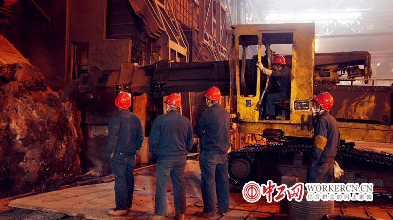 图为炼钢工正在用拆炉机清除转炉外炉。中工网记者 葛姗 摄