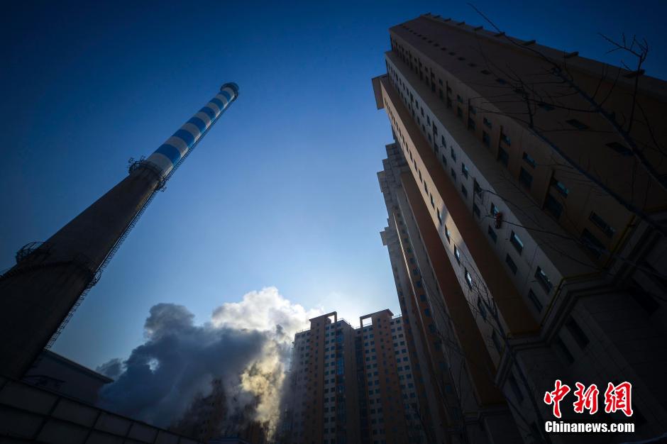 12月11日,新疆首府乌鲁木齐市主城区一座燃气供热站正在正常运行,为附近楼宇提供热能,而高耸的燃煤锅炉烟囱已不再使用。中新社发 刘新 摄
