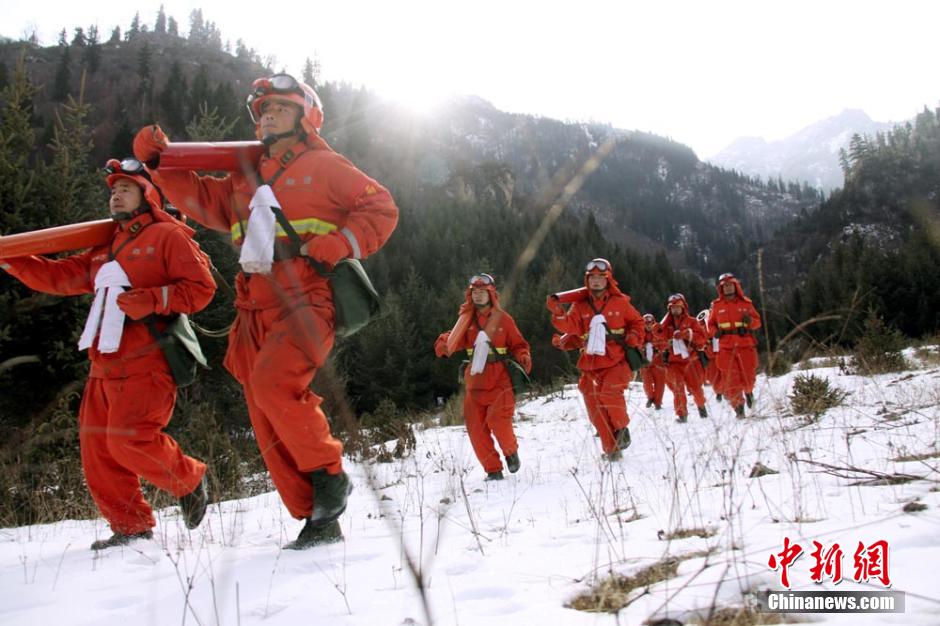 12月11日下午,甘肃甘南藏族自治州迭部县某林区一线浓烟滚滚、火苗肆虐、机具轰鸣……这是一场警地联合灭火实战演练。参战的武警迭部森林大队、迭部县林业总场两支队伍共计100名扑火队员,在现场指挥员统一调遣下迅速出击、密切配合,在40分钟内实现火场全线告捷。图为“灾”情发生后,森警赶赴“火场”。赵二强 摄