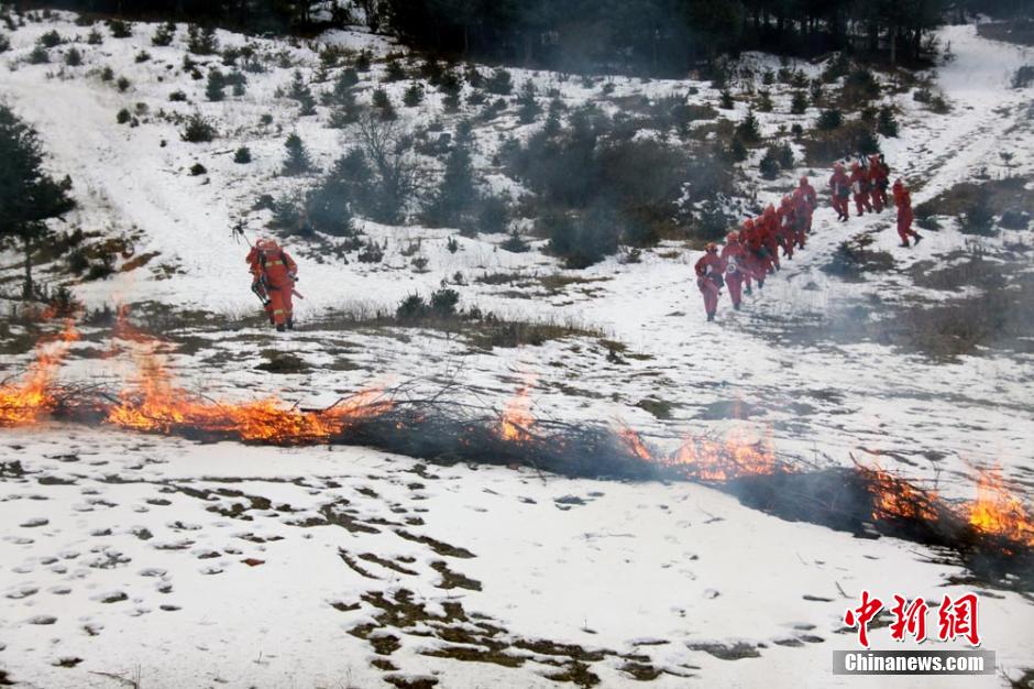 12月11日下午,甘肃甘南藏族自治州迭部县某林区一线浓烟滚滚、火苗肆虐、机具轰鸣……这是一场警地联合灭火实战演练。参战的武警迭部森林大队、迭部县林业总场两支队伍共计100名扑火队员,在现场指挥员统一调遣下迅速出击、密切配合,在40分钟内实现火场全线告捷。图为“灾”情发生后,森警到达“火场”。赵二强 摄