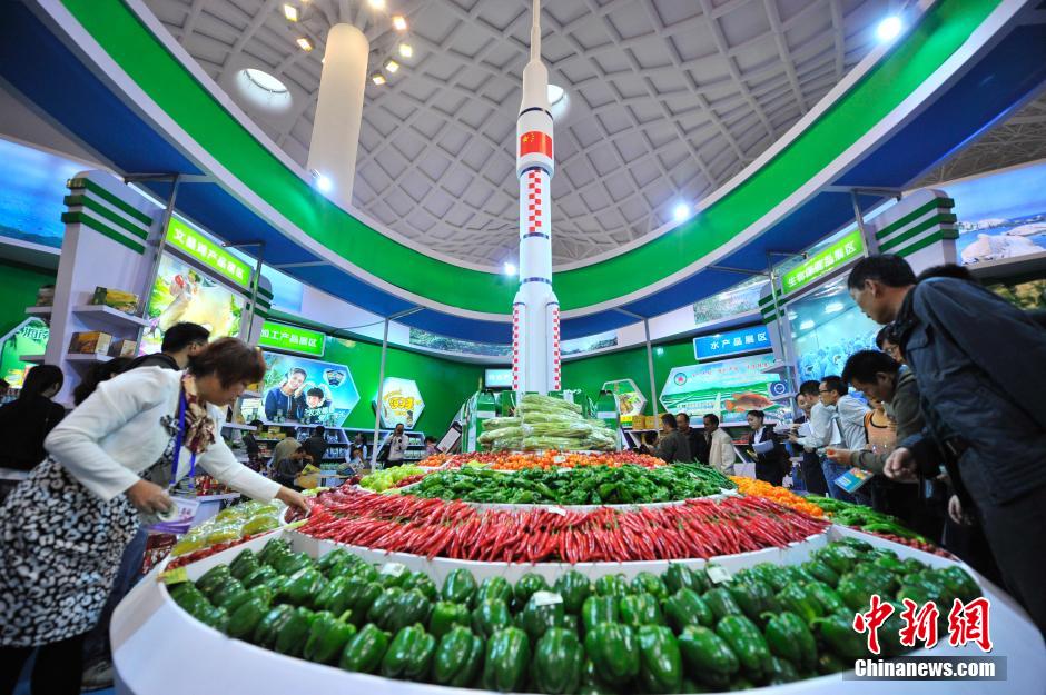 12月12日,2013年中国(海南)国际热带农产品冬季交易会在海南国际会展中心开幕。已成功举办15届的冬交会,今年以“安全、绿色、科技、品牌”为主题,共设5大展区,37个展馆,会展总面积达48900平方米,时间将持续到15日。图为展会现场展示的航天育种蔬菜。中新社发 骆云飞 摄