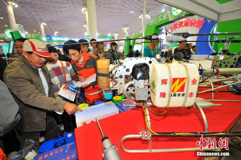 12月12日,2013年中国(海南)国际热带农产品冬季交易会在海南国际会展中心开幕。已成功举办15届的冬交会,今年以“安全、绿色、科技、品牌”为主题,共设5大展区,37个展馆,会展总面积达48900平方米,时间将持续到15日。图为展会现场展示的无人机喷施农药装备亮相冬交会。中新社发 骆云飞 摄