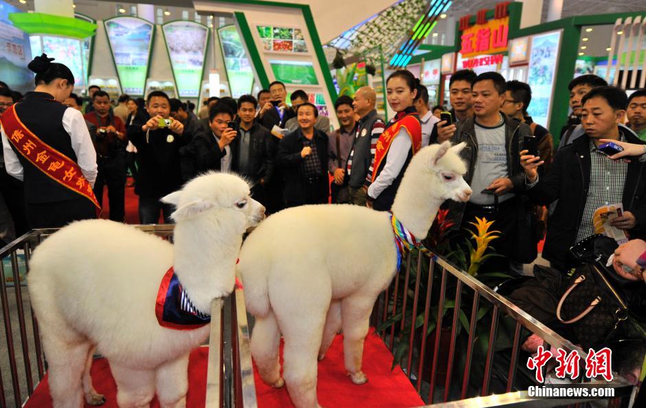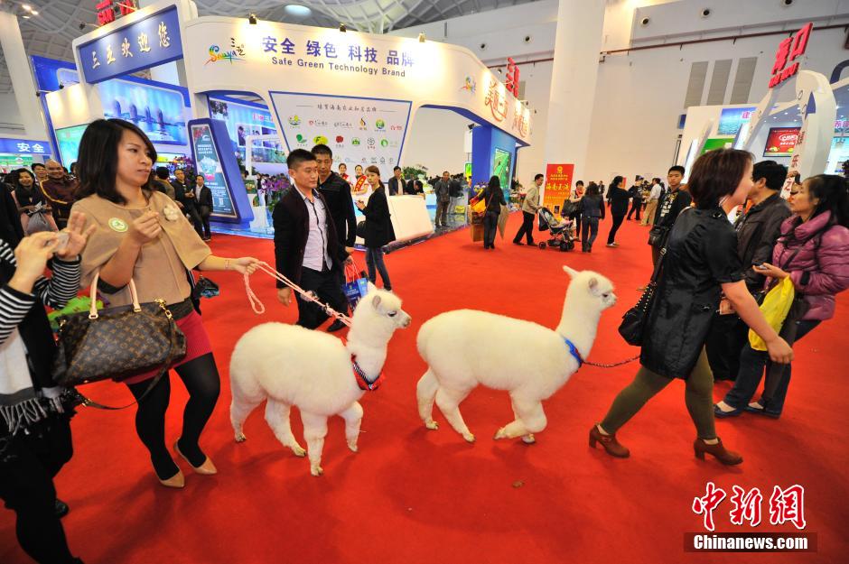 12月12日,2013年中国(海南)国际热带农产品冬季交易会在海南国际会展中心开幕。展区内,各大参展商都频出奇招,两只约1米高的雪白可爱的羊驼现身展会现场成了招牌“门神”,吸引市民前来参观。中新社发 骆云飞 摄