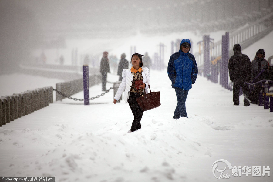 11月25日,吉林省吉林市再次遭遇大雪天气,市民在雪中出行。中央气象台11月25日06时继续发布暴雪黄色预警:预计,25日08时至26日08时,黑龙江中东部、吉林东部有大到暴雪,其中,吉林东北部、黑龙江中部偏东的部分地区有大暴雪,局部地区有特大暴雪(30~40毫米)。上述地区积雪深度将有5~15厘米,局部地区可达18~40厘米。降雪的同时伴有5~6级偏北风,部分地区将出现暴风雪。图片来源:CFP视觉中国