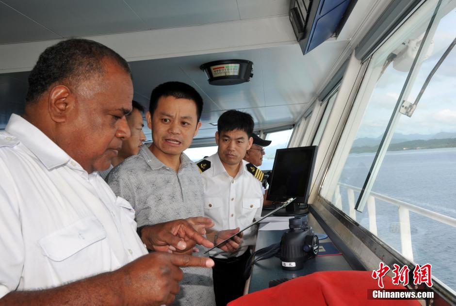 12月6日,中国远洋航天测量船“远望6号”停靠南太平洋上斐济群岛共和国首都苏瓦,中国驻斐济使馆、中资机构和华人华侨代表在码头上拉起横幅欢迎中国远洋航天测量船停靠。这是“远望6号”第14次停靠外国港口,也是其第8次停靠苏瓦港。此次靠港期间,“远望6号”将开展设备检修、物资补给、人员休整和后续海上测控任务准备等工作。中新社发 孙自法 摄