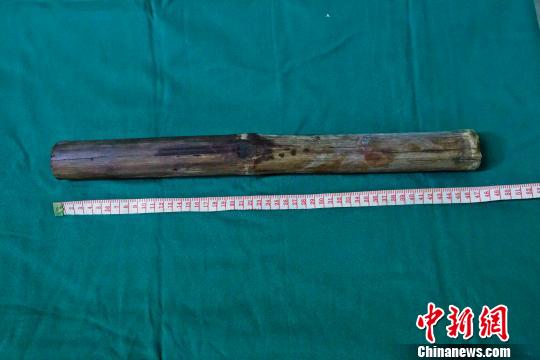12月14日上午,广西来宾市象州县一37岁男子在凌晨一点不慎从5楼摔落,下体被一根直径7厘米粗的竹杆,从会阴部的阴囊处直穿通出大腿后跟部,被紧急从象州县转送到柳州市工人医院急诊科。图为刺穿男子的竹杆。吴永岚 摄
