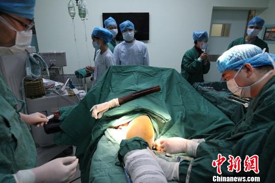 12月14日上午,广西来宾市象州县一37岁男子在凌晨一点不慎从5楼摔落,下体被一根直径7厘米粗的竹杆,从会阴部的阴囊处直穿通出大腿后跟部,被紧急从象州县转送到柳州市工人医院急诊科。 吴永岚 摄