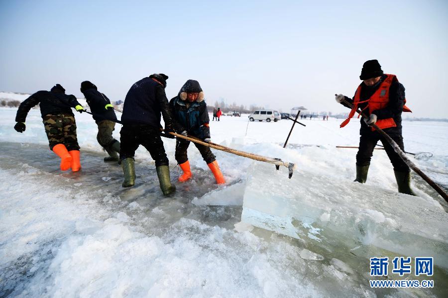 “一、二,起!”冰封的松花江,一声声粗犷的起冰号子在江面上此起彼伏。在冬季旅游火爆的哈尔滨,每年一度的采冰造景是件大事,数以百计的采冰队伍在给当地冰雪经济出力的同时,也为自己找到了一条致富路。 12月的哈尔滨寒风刺骨,记者在采冰现场看到,半米多厚的冰面被电锯初步切割成1.6米长、0.8米宽的长方体,每个冰块重量都在1000斤以上。采冰人先用木槌和钎子把冰块扎离,再合力用铁钩把冰块拖上来,然后用叉车运走。 “采冰看着简单,却是个技术和力气都要过硬的活儿。”一位采冰人告诉记者,“以前农村‘3个月种田,9个月干闲’。这些年生活方式慢慢变了,越来越多的人愿意出来,打工或采冰什么的贴补家用,日子也不单调了。” 多年来,采冰供冰已成为村民冬闲时的一笔重要收入。“我们全家种地一年挣两万元左右,如果一个采冰季能干满30天,每人每天200多块,一个月下来就是7000元左右,这个年过得就锦上添花了。”一位采冰人边算边说。为保证安全,采冰队还给采冰人买了保险。采冰人每天在冰面工作都得10个小时以上,摔跟头、掉进冰水甚至受伤都难以避免,有了保险就为大家添了一份保障。新华社记者 王凯摄