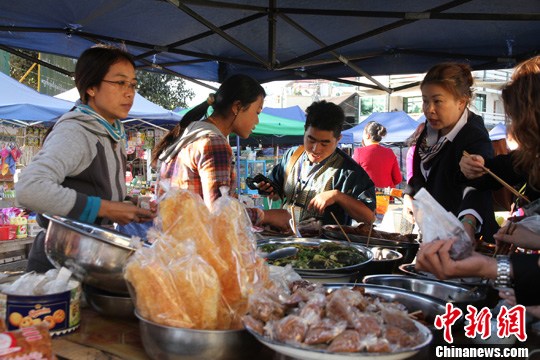 图为中国游客在缅甸南坎集市品尝小吃。中新社发 吴华丽 摄