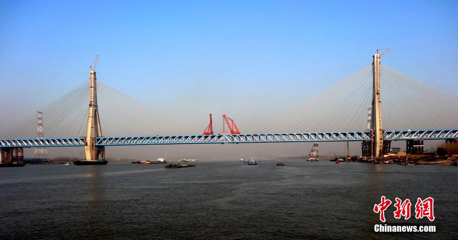 12月19日,随着中国中铁大桥局施工人员将最后一根冲钉插打到位,京福(北京至福州)高铁跨越长江的控制性工程——安徽铜陵长江公铁两用大桥顺利实现合龙。该桥主跨达630米,超过了武汉天兴洲公铁两用长江大桥(主跨504米),再次刷新了世界公铁两用桥梁跨度的新纪录。铜陵长江公铁两用大桥全长51.2公里,其中跨江主桥全长1290米,采用两塔五跨斜拉桥结构。大桥分为上下两层,下层为四线铁路,由京福高速铁路双线和庐铜I级双线铁路组成,上层为六车道高速公路。图为11月29日,铜陵公铁两用长江大桥全景。中新社发 舒智明 摄