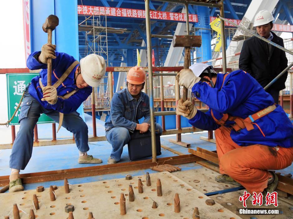 12月19日,随着中国中铁大桥局施工人员将最后一根冲钉插打到位,京福(北京至福州)高铁跨越长江的控制性工程——安徽铜陵长江公铁两用大桥顺利实现合龙。该桥主跨达630米,超过了武汉天兴洲公铁两用长江大桥(主跨504米),再次刷新了世界公铁两用桥梁跨度的新纪录。铜陵长江公铁两用大桥全长51.2公里,其中跨江主桥全长1290米,采用两塔五跨斜拉桥结构。大桥分为上下两层,下层为四线铁路,由京福高速铁路双线和庐铜I级双线铁路组成,上层为六车道高速公路。图为建桥工人将一根根冲钉插打到位。中新社发 舒智明 摄