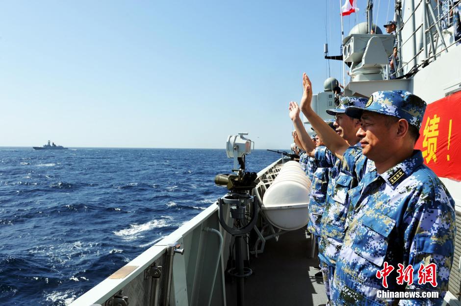 当地时间12月23日上午10时30分,中国海军第十五批和第十六批护航编队在亚丁湾开始分航。第十五批护航编队告别战斗了4个月的亚丁湾、索马里海域,第十六批护航编队正式开始护航。图为鸣笛一分钟,舱面人员分区列队挥手致意。中新社发 李晓 摄