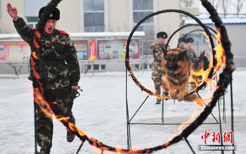 为确保元旦期间辖区安全稳定,全力推进冬季大练兵活动。新疆边防总队老吉木乃边防派出所联合解放军边防连、兵团民兵、群众护边员在中哈边境一线开展处置边境突发事件演练。通过演练,使军警兵民协同处突能力进一步增强,为维护辖区稳定打下了坚实的基础。图为警犬训导员指挥警犬跳跃火圈。张巍巍 摄