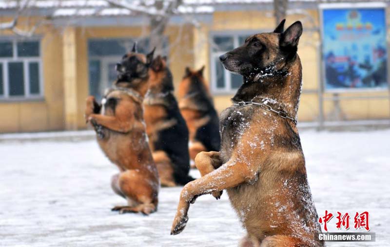 为确保元旦期间辖区安全稳定,全力推进冬季大练兵活动。新疆边防总队老吉木乃边防派出所联合解放军边防连、兵团民兵、群众护边员在中哈边境一线开展处置边境突发事件演练。通过演练,使军警兵民协同处突能力进一步增强,为维护辖区稳定打下了坚实的基础。图为警犬训导员指挥警犬进行“坐立”训练。 张巍巍 摄