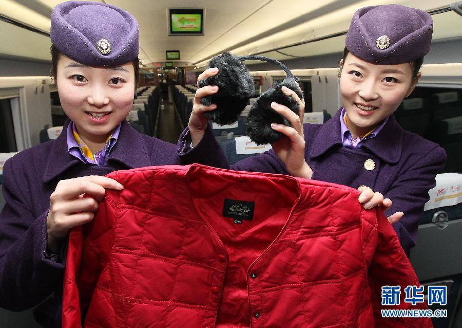 12月28日,上海虹桥至沈阳G1258次列车上的乘务员在展示上海铁路局配发的保暖内衣胆和护耳套,为在东北地区服务运营做好准备。当日,上海铁路局新增开了上海虹桥至沈阳北等方向的30对动车组列车。随着首列上海虹桥开往沈阳的G1258次高铁列车正点始发,我国长三角地区到东北地区高铁“朝发夕至”成为现实,并将缓解2014年春运压力。新华社记者 陈飞 摄