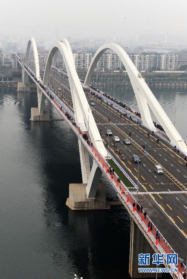 12月30,车辆在柳州广雅大桥上行驶。当日,广西柳州广雅大桥建成通车。广雅大桥全长1410米,其中主桥长546米,宽30米,设机动车双向6车道。广雅大桥的通车,使得柳州市区横跨柳江的大桥增加到19座,柳州城中片与河西片有了更便捷的通道。新华社记者 李斌 摄