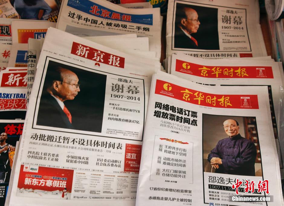 北京媒体头版报道邵逸夫去世