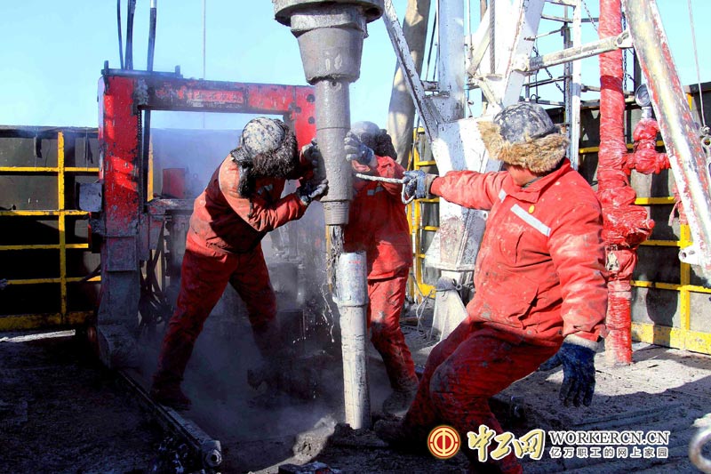 2014年1月12日,黑龙江大庆市正直隆冬天气,当天的气温已经下降到零下28度,冷风夹着雪花打在脸上像刀子割一样疼痛。在这样的极端天气里,大庆1202钻井队的队员们依然坚守在生产一线,用他们的实际行动生动地诠释了“有第一就争 见红旗就抗”的尖刀精神。(吕毅)