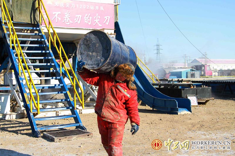 四班副司钻“大胖”康玉伟把用过的油料桶从井场扛到指定的位置存放起来。