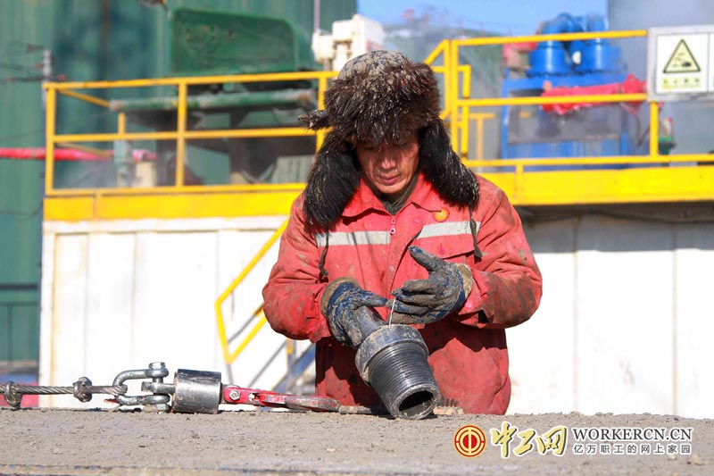副司钻张族波正在仔细的收拾钻具,为接单根做好准备工作。