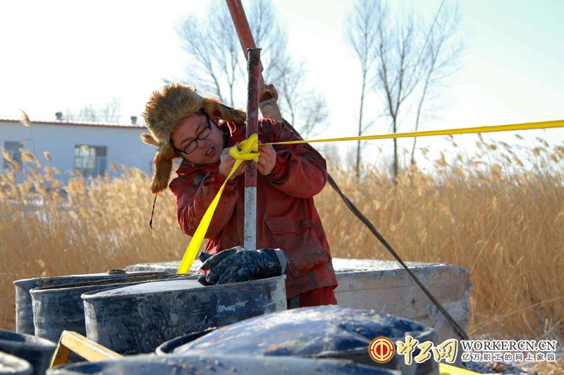 2014年1月12日,黑龙江大庆市正直隆冬天气,当天的气温已经下降到零下28度,冷风夹着雪花打在脸上像刀子割一样疼痛。在这样的极端天气里,大庆1202钻井队的队员们依然坚守在生产一线,用他们的实际行动生动地诠释了“有第一就争 见红旗就抗”的尖刀精神。(吕毅)