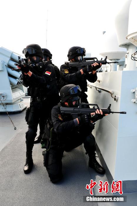 当地时间1月11日,中国海军盐城舰特战分队在地中海叙利亚西部海域进行了防化条件下的轻武器实弹射击训练,锻炼提升了官兵在复杂条件下的轻武器实战能力。图为特战队员进行防化条件下演练。中新社发 李晓 摄