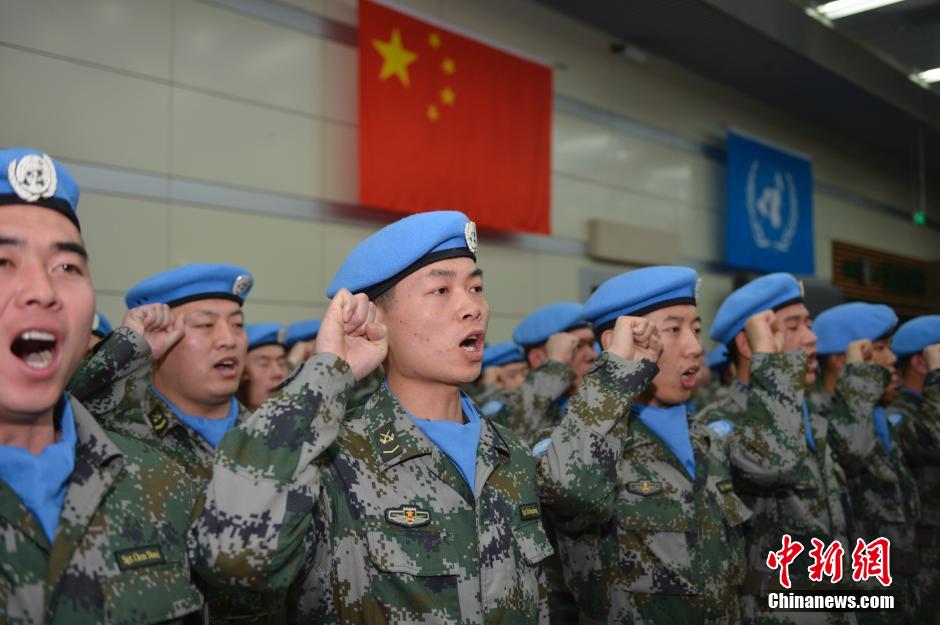 1月15日,沈阳军区16集团军在哈尔滨太平机场举行仪式,欢送首批赴马里维和工兵、警卫分队后续部队245名官兵启程。图为面对国旗庄严宣誓的官兵们。中新社发 杨再新 摄