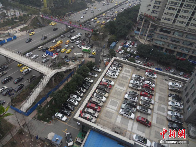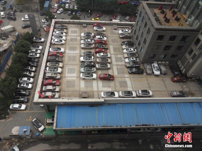 1月17日,重庆渝北区新牌坊一拣楼房二楼露天平台上,整齐的排放着数十辆轿车,市民感叹:车子俨然停在了半空中,俯瞰下去,真有点航空母舰的感觉。中新社发 人云 摄
