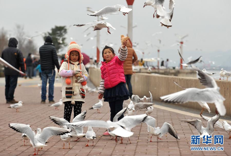1月20日,两名小朋友穿着包裹严实的冬装在昆明市滇池大坝上给红嘴鸥喂食。当日正值大寒节气,受北方强冷空气影响,“春城”昆明遭遇寒流,最高气温较几天前的17摄氏度大幅下降至5摄氏度左右。很多市民穿上厚厚的冬装,来到滇池大坝等地给前来越冬的红嘴鸥喂食。新华社记者 蔺以光 摄
