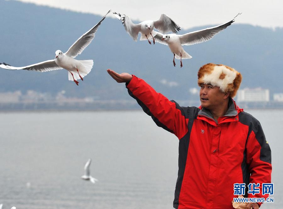 1月20日,一名男子穿着包裹严实的冬装在昆明市滇池大坝上给红嘴鸥喂食。当日正值大寒节气,受北方强冷空气影响,“春城”昆明遭遇寒流,最高气温较几天前的17摄氏度大幅下降至5摄氏度左右。很多市民穿上厚厚的冬装,来到滇池大坝等地给前来越冬的红嘴鸥喂食。新华社记者 蔺以光 摄