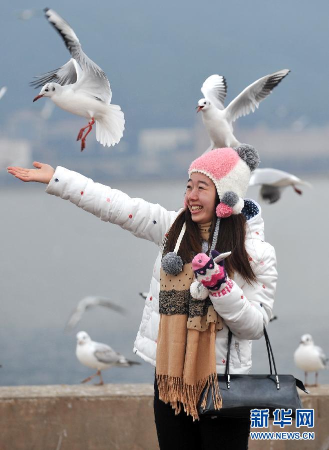 1月20日,一名年轻姑娘穿着包裹严实的冬装在昆明市滇池大坝上给红嘴鸥喂食。当日正值大寒节气,受北方强冷空气影响,“春城”昆明遭遇寒流,最高气温较几天前的17摄氏度大幅下降至5摄氏度左右。很多市民穿上厚厚的冬装,来到滇池大坝等地给前来越冬的红嘴鸥喂食。新华社记者 蔺以光 摄