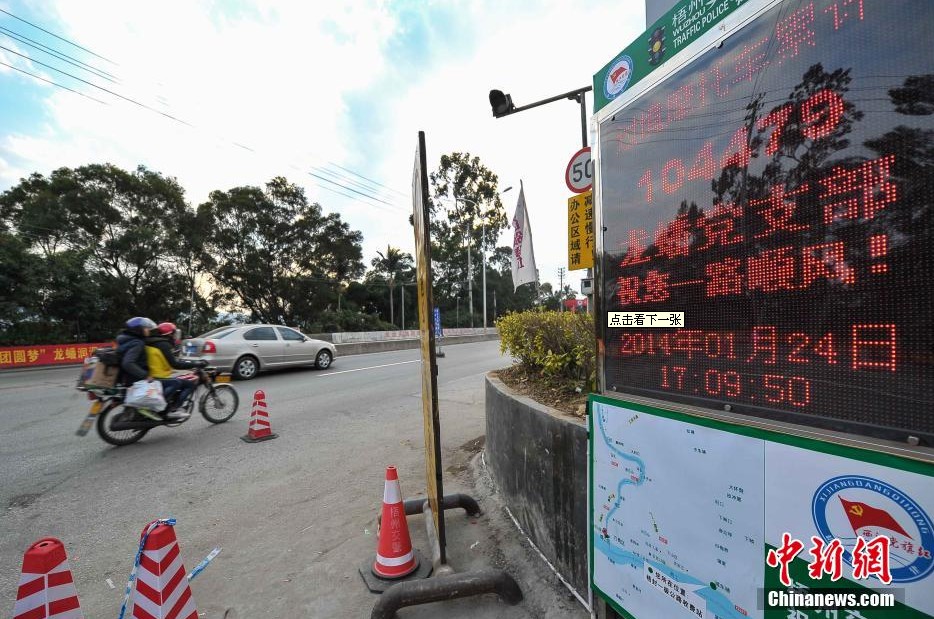 1月16日至24日,从广东驾驶摩托车途经广西梧州返乡的大军已突破十万,随着春节临近,每天过境的摩托车数量还将增加。梧州交警部门在部分县市交界处设立春运服务站,为返乡民众提供帮助。图为1月24日,交警设在321国道梧州东出口的过境摩托车计数牌。中新社发 洪坚鹏 摄