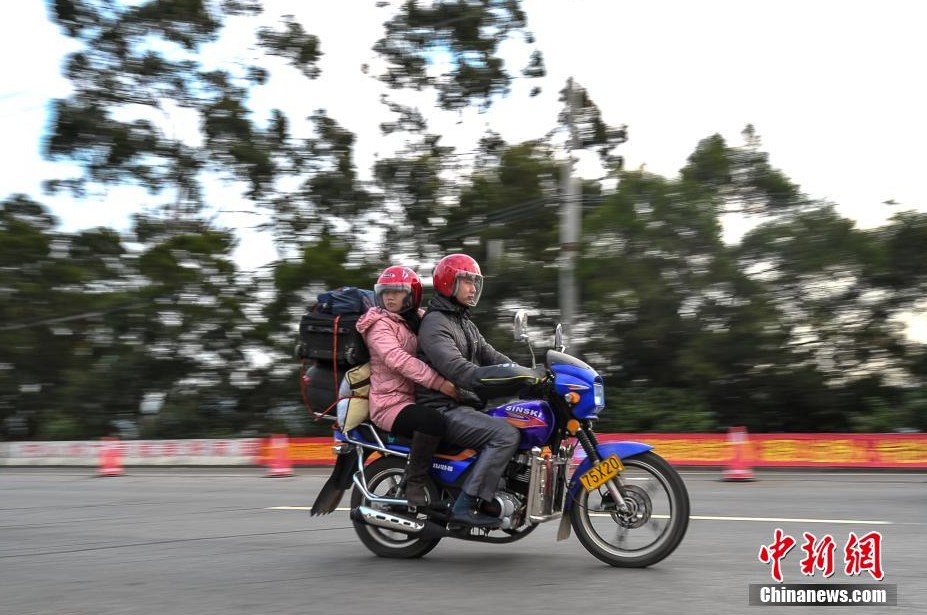 1月16日至24日,从广东驾驶摩托车途经广西梧州返乡的大军已突破十万,随着春节临近,每天过境的摩托车数量还将增加。梧州交警部门在部分县市交界处设立春运服务站,为返乡民众提供帮助。图为进入梧州境内的返乡民众。中新社发 洪坚鹏 摄
