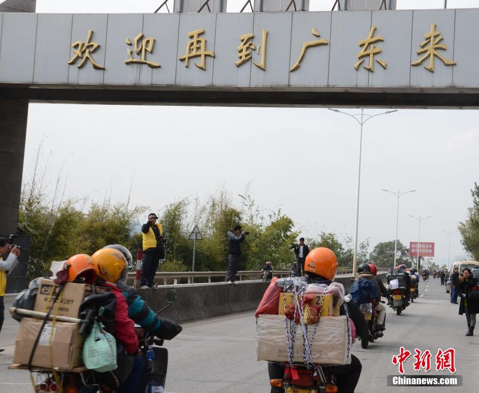 1月24日,民众自发礼送途经广东肇庆离粤返乡的“10万铁骑”。“暖流行动”是广东省总工会联合有关部门及地市在春运期间开展“情暖外来工”的系列活动之一。今年该省还在韶关、河源新增了服务点,为往返广东的为60万铁骑提供免费服务。图为“铁流”即将进入广西境内。中新社发 黄耀辉 摄