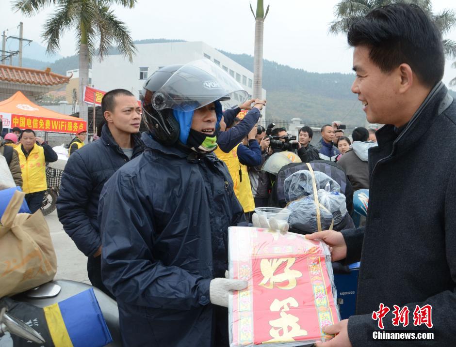 1月24日,民众自发礼送途经广东肇庆离粤返乡的“10万铁骑”。“暖流行动”是广东省总工会联合有关部门及地市在春运期间开展“情暖外来工”的系列活动之一。今年该省还在韶关、河源新增了服务点,为往返广东的为60万铁骑提供免费服务。图为德庆县委书记梁为东(右)在德庆服务店向进点休息的“骑手”送去春联。中新社发 黄耀辉 摄