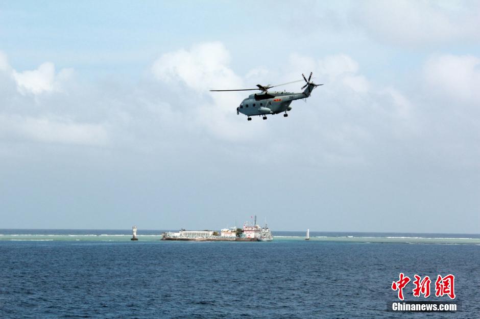 1月25日下午,中国海军南海舰队远海训练编队结束对南沙群岛各礁及其附近海域为期3天的巡航,继续向南挺进。图为南海舰队远海训练编队直升机空中巡航南沙。中新社发 高毅 摄