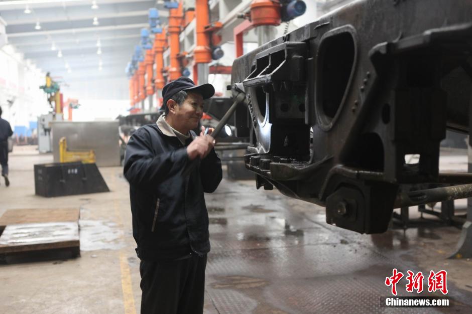 1月26日是2014年春运第11天,随着春节的日益临近,南昌铁路局南昌南车辆段职工正加大货物车辆检修力度,加快货车周转,确保年货物资运输安全畅通、准时高效,防止因车辆故障影响年货按时到达。图为南昌南车辆段职工正在流水线上检修分解后的车辆转身架。张华 摄