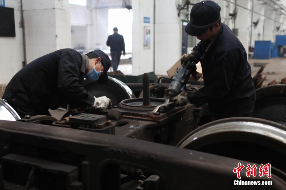 1月26日是2014年春运第11天,随着春节的日益临近,南昌铁路局南昌南车辆段职工正加大货物车辆检修力度,加快货车周转,确保年货物资运输安全畅通、准时高效,防止因车辆故障影响年货按时到达。图为南昌南车辆段职工正在分解故障车辆转向架。张华 摄