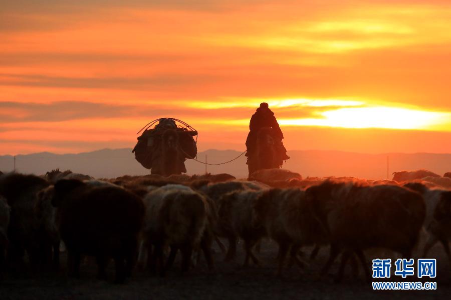 1月27日,在新疆哈密巴里坤哈萨克自治县三塘湖的戈壁上,牧民骑着骆驼赶着羊群转场。