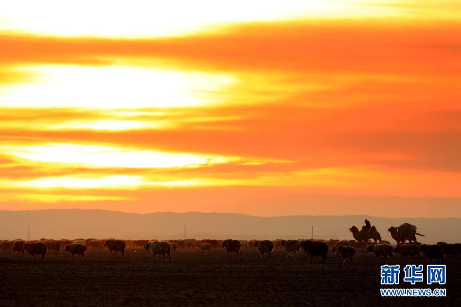 1月27日,在新疆哈密巴里坤哈萨克自治县三塘湖的戈壁上,牧民骑着骆驼赶着羊群转场。