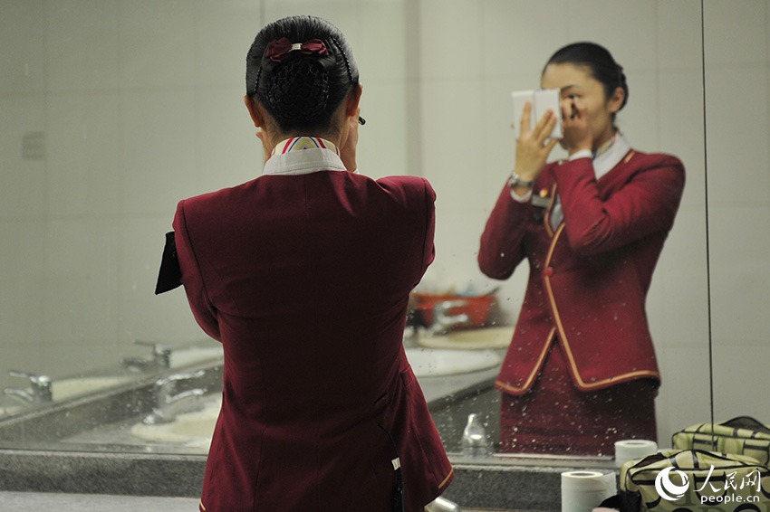 清晨微光:5点20分,天还没亮,列车长李娜与宿舍里的姑娘们已经起床开始整理化妆。(人民网记者 关腾飞 摄)图片来源:人民网